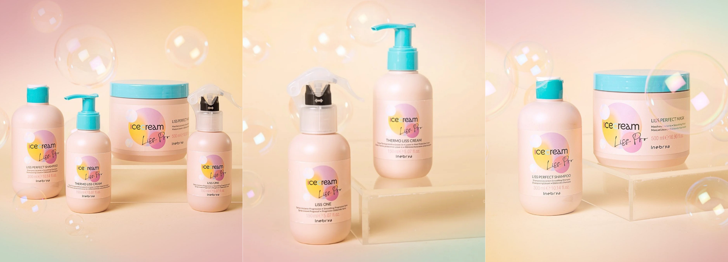 The Inebrya Ice Cream Liss Pro family is designed to smooth and tame unruly, frizzy, or voluminous hair, helping create sleeker, more manageable strands with a softer feel. Created to support hair that resists control or looks puffed-up, this range works to reduce frizz, calm texture, and improve smoothness over time with progressive results. Its caring formulas help hair feel smoother and easier to style, protect against humidity, and enhance shine without weighing hair down. Ideal for anyone seeking a smoother, more disciplined look, the Liss Pro family leaves hair feeling softer to the touch and beautifully balanced with every use.