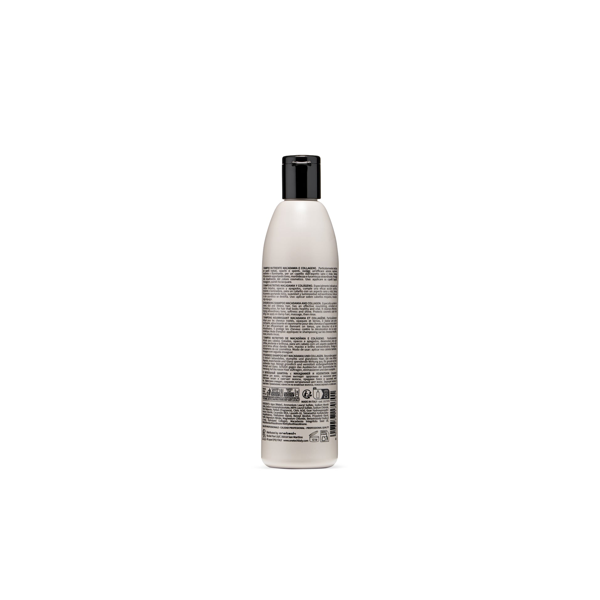 Champú nutritivo de macadamia y colágeno. Especialmente indicado para cabellos tratados, apagados y sin vida, ofrece una eficaz acción nutritiva, emoliente e iluminadora, para un cabello sano y vital. Limpia eficazmente, aportando una extraordinaria tonicidad, suavidad y brillo. Protege el color del cabello teñido, evitando que se decolore.