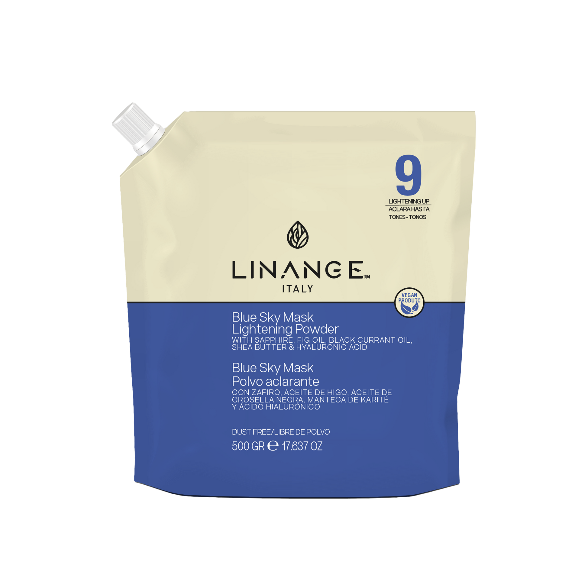 Blue Sky Mask Lightening Powder: Formulated with Sapphire Powder, Fresh Fig and Blackcurrant Oil to promote hair vitality, combined with the fatty acids of Shea Butter to soften the cuticles and fermented Hyaluronic Acid to protect the hair structure during lightening up to 9 levels. As a strong, intense and fast-acting bleaching powder, Linange offers it to professionals and is essential for every salon.